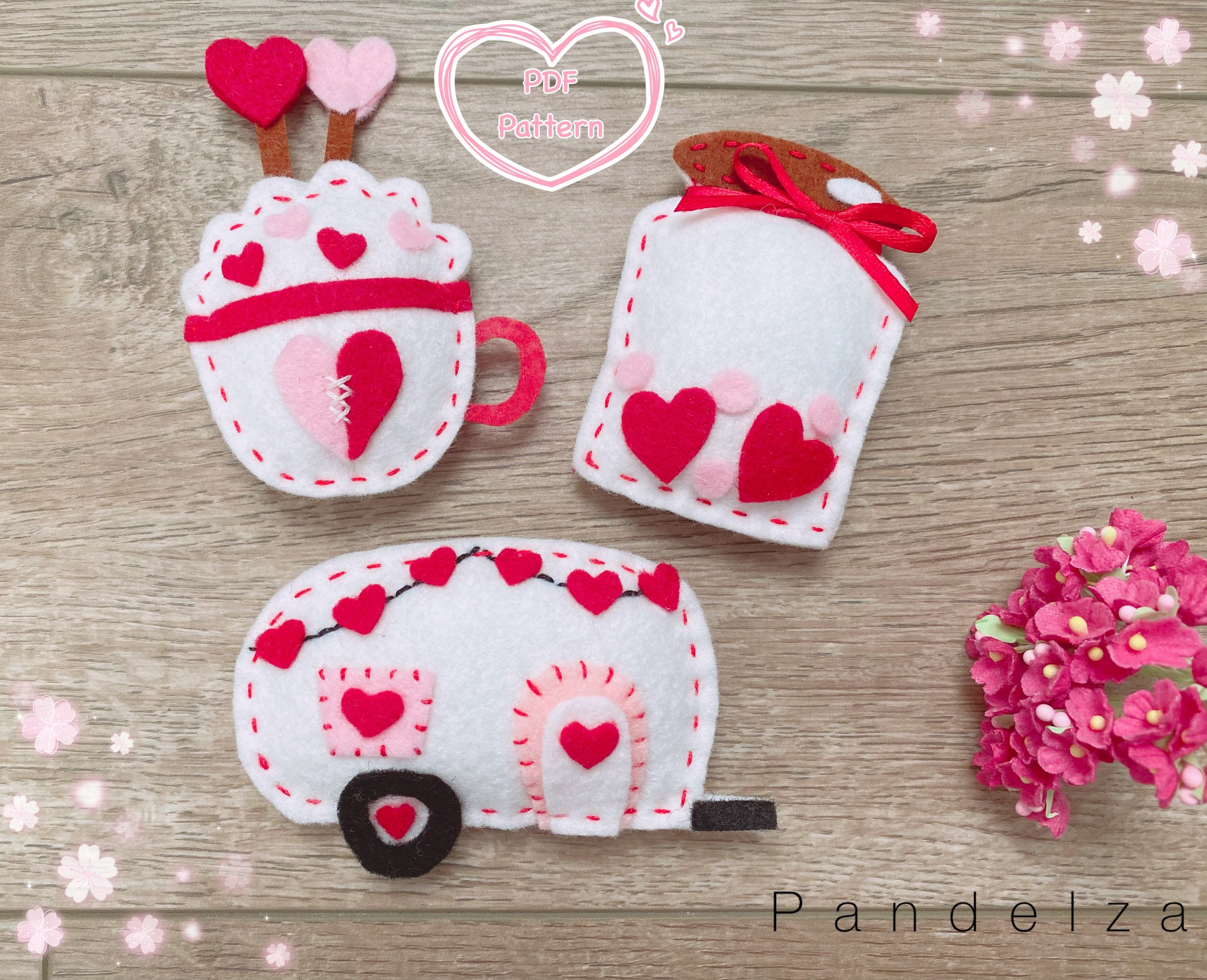 PDF Pattern set of 3 with video: Valentine's felt craft. DIY Valentine's felt trailer camper, heart in the jar, couple cappuccino. Ornaments